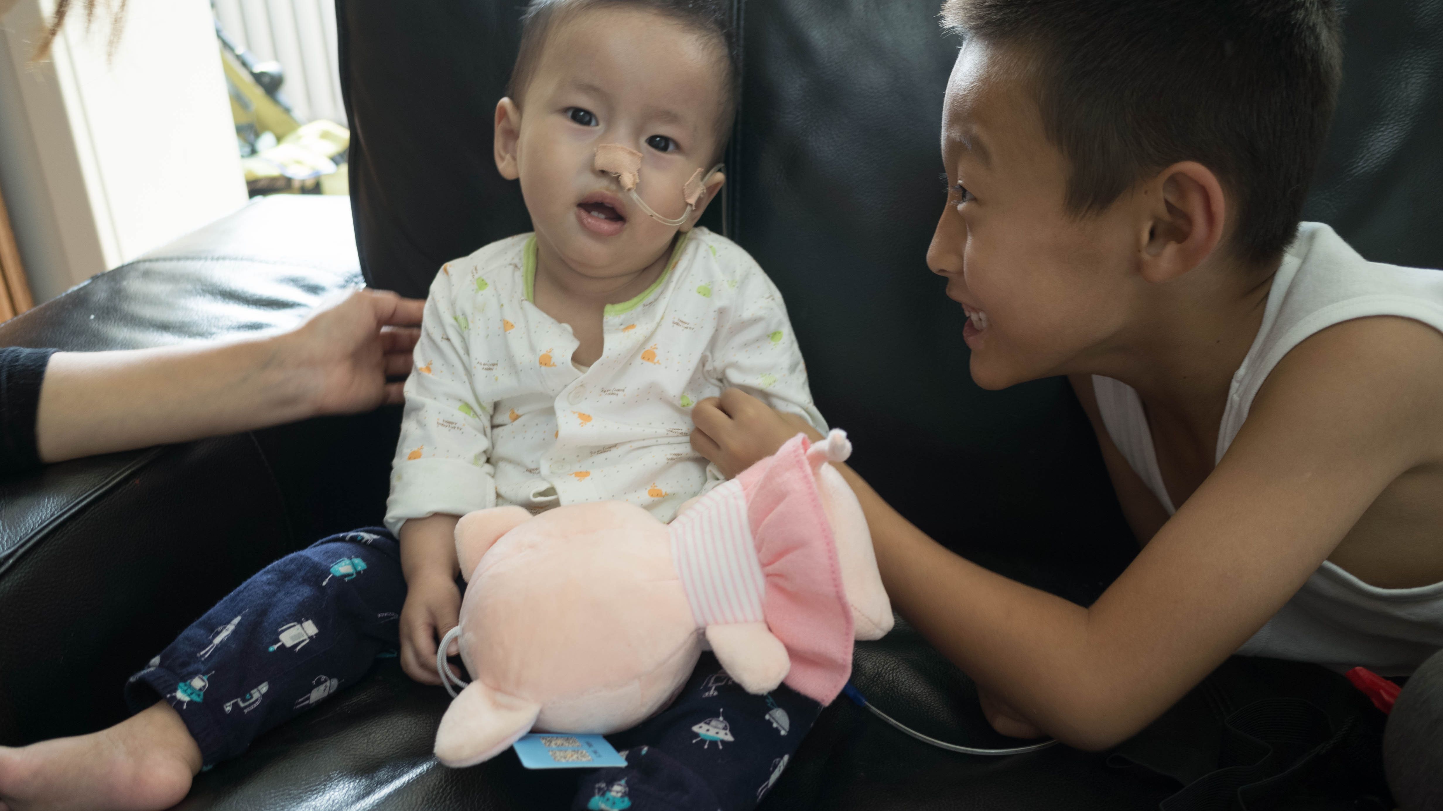 △ 2018年10月13日,北京市海淀区,今年刚上一年级的哥哥在逗齐齐,齐齐出生前就是哥哥钦定的玩伴。今年4月,齐齐进ICU时家里人都瞒着哥哥,出院后爸爸告诉哥哥实情,他也承担起了照顾弟弟的任务。