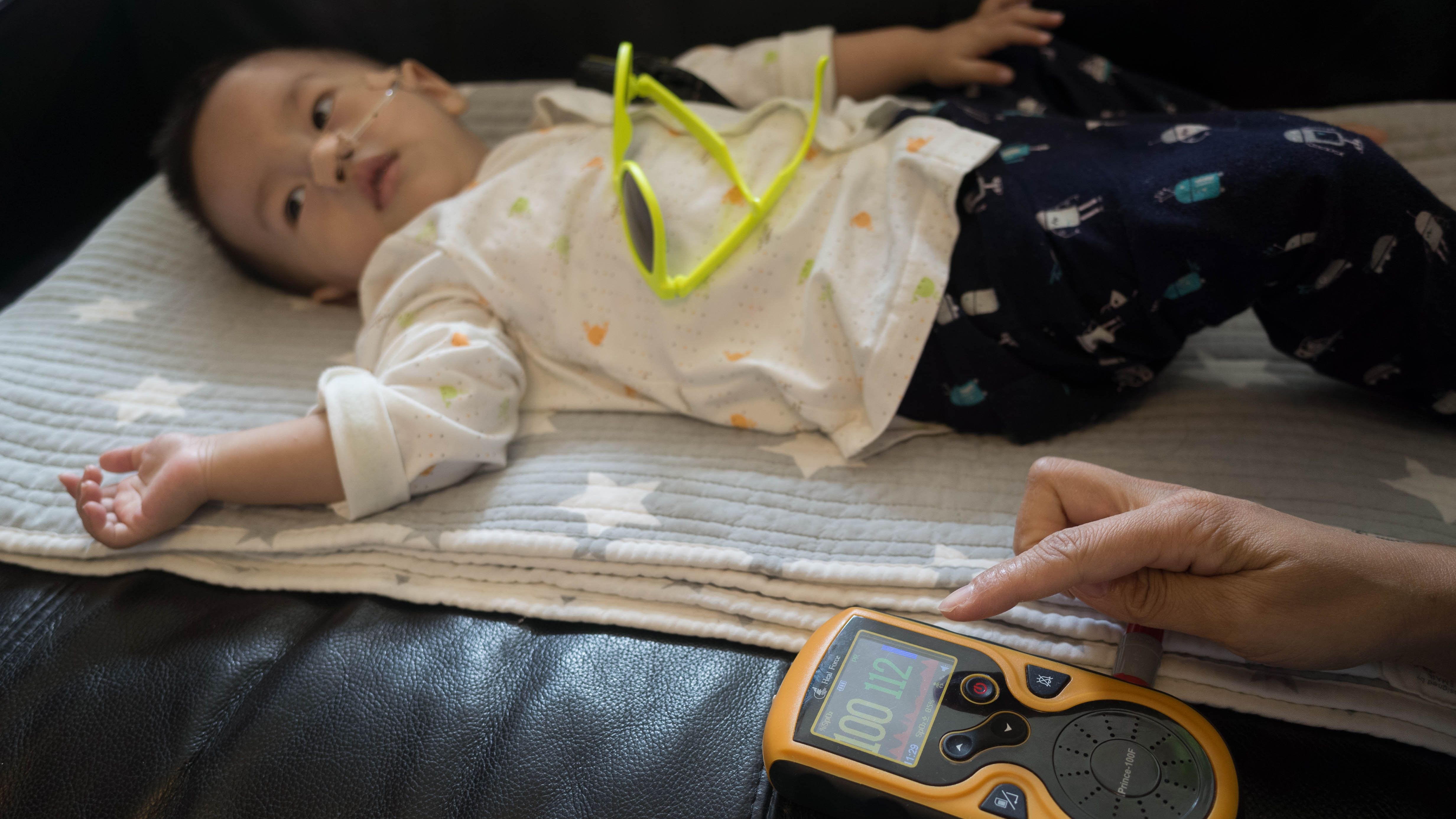 △ 2018年10月15日,北京市通州区,松子在使用咳痰机,每次做三组,一组三个,重复吸、咳动作。机器刚到的时候松子爸妈自己试用了一下,“就像把空气‘砰’一下打到肺里,别提多难受了。”咳痰机对脊髓性肌萎缩症患者来说是救命机,一台新品咳痰机售价在30000人民币左右。