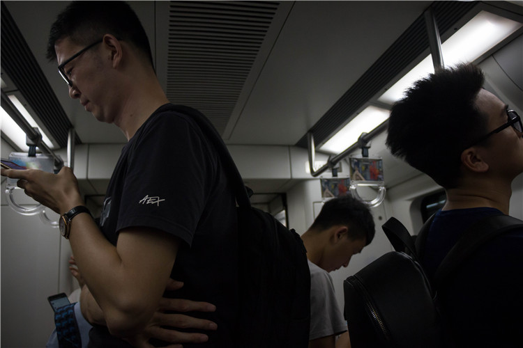 △ 2018年8月28日,地铁十号线,苏佳宇只要稍微一踮脚,头皮就能挨上车厢顶。