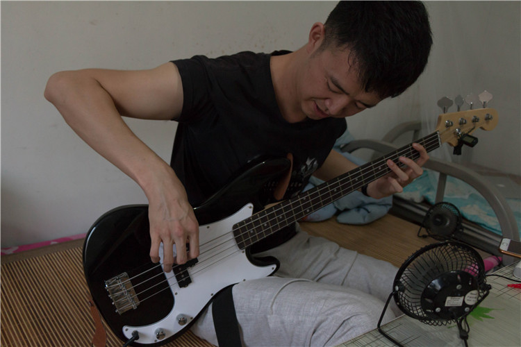 △ 2018年8月28日,北京市昌平区,苏佳宇在暂时借住的出租屋内用自己淘的“烧火棍”贝斯练习基本功。今年4月才加入8772乐队的苏佳宇已经熟练掌握乐队11首曲目中的贝斯部分。