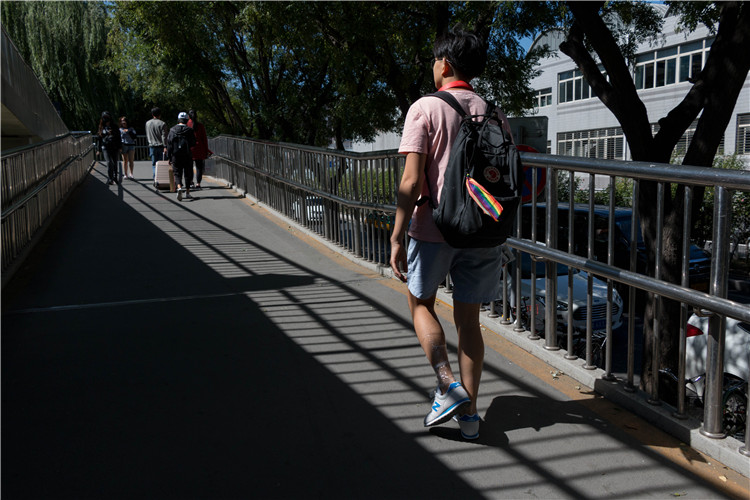 △ 2018年9月22日,北京市朝阳区传媒大学地铁站,刚文完身的卡尔曼综合征患者潘龙飞准备坐地铁回家给女朋友做饭。他是个双性恋,书包上系的彩虹条是之前去台湾参加同性恋日活动带回来的。
