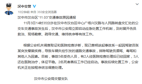 据“汉中交警”官方微博消息,11月3日14时35分许在汉中市汉台区中心广场兴汉路与人民路转盘交汇处的公交车交通事故发生后,汉中市公安局立即启动应急处置工作机制,及时展开伤员救治、现场勘察、疏导交通、维持秩序等有效工作。