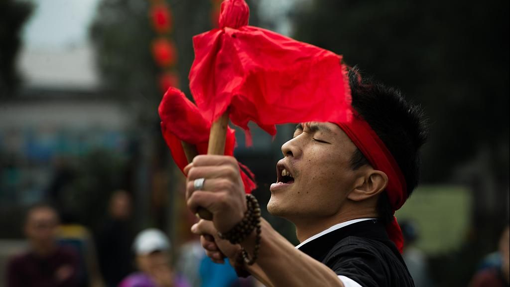 ▲浙江丽水古堰画乡,村民兼画家叶波洪在通坪码头表演船帮号子。 图文无关 图片来源:视觉中国