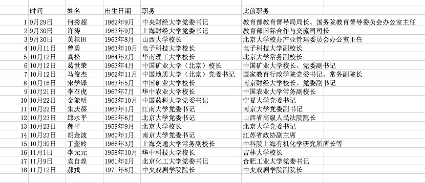 新京报记者统计发现,9月底以来,至少17所高校更换党政一把手。