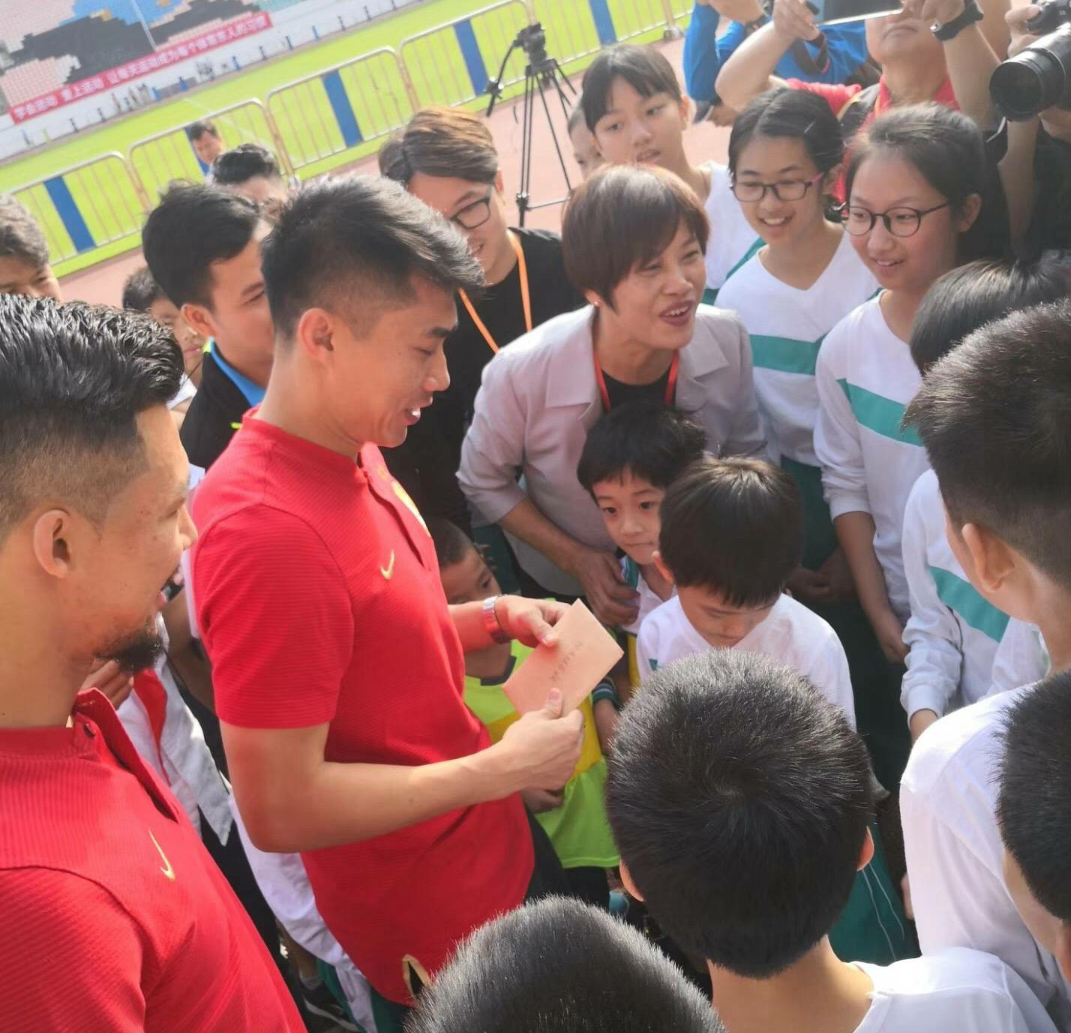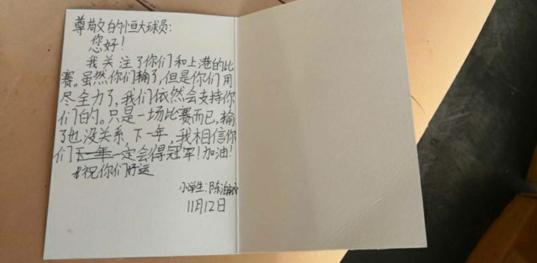 今日的运动会现场,小陈就读的体育东路小学安排他与郑智、张琳芃见了面,小陈当面递给郑智一个写着“恒大球员收”字样的信封,信中写道:“我关注了你们和上港的比赛。虽然你们输了,但是你们用尽全力了,我们依然会支持你们的。只是一场比赛而已,输了也没关系,下一年,我相信你们一定会得冠军!加油!祝你们好运!”