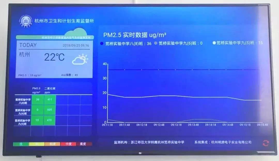 该室内空气在线检测神器,目前在江干区的5所中小学校和富阳区的6所中小学校进行前期试点,试点学校的显示屏均已安装完毕并正式投入使用。