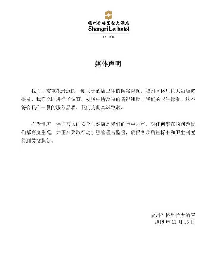11月15日,福州香格里拉酒店对媒体曝光五星酒店卫生乱象做出道歉回应。