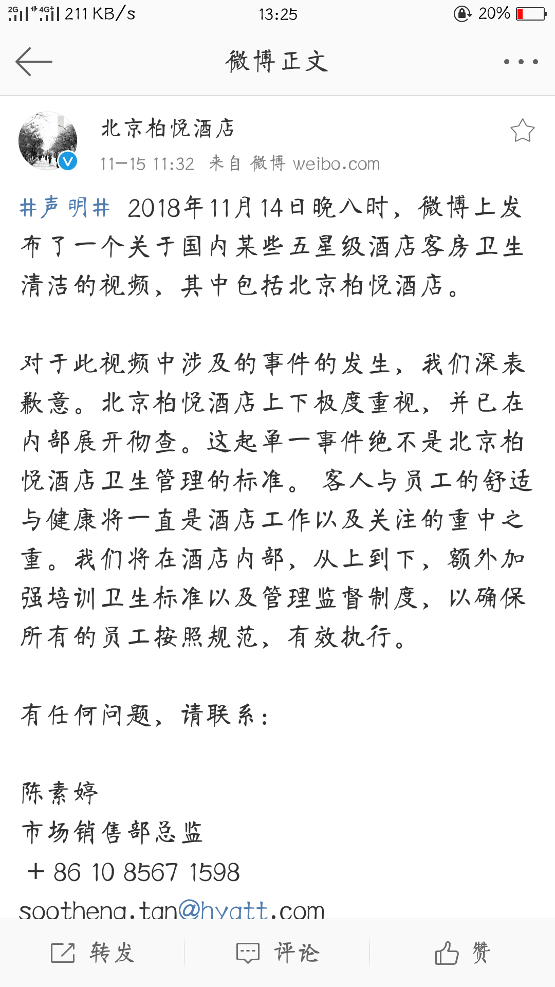 北京柏悦酒店对媒体曝光的卫生问题发文致歉。微博截图