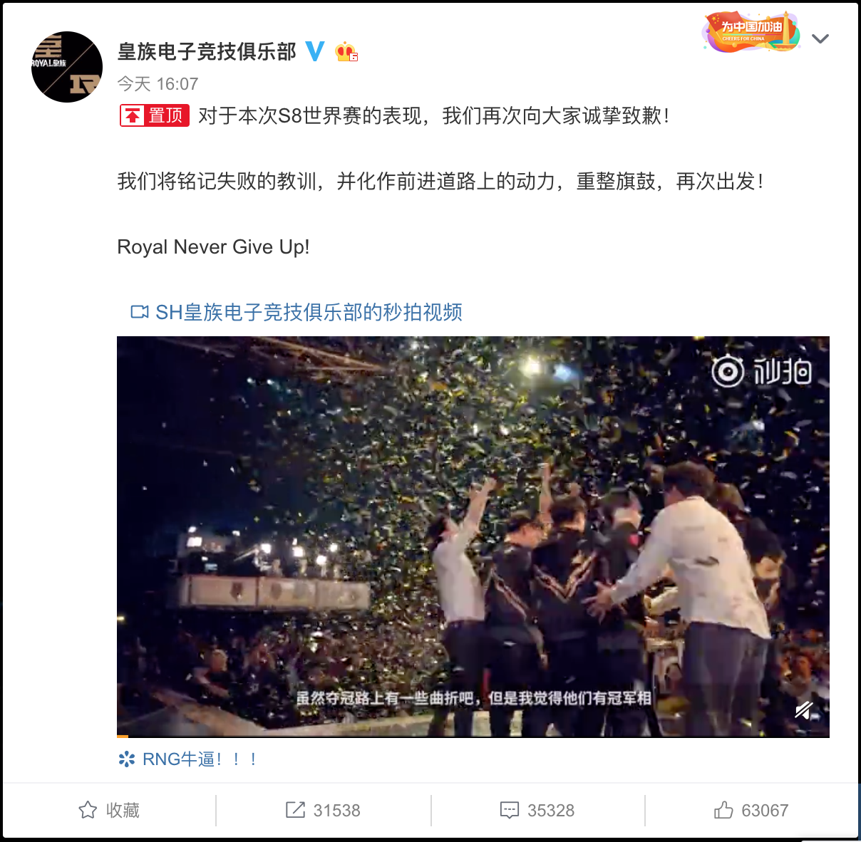 RNG发微博称:对于本次S8世界赛的表现,我们再次向大家诚挚致歉!我们将铭记失败的教训,并化作前进道路上的动力,重整旗鼓,再次出发!