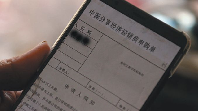 ▲10 月27 日,一名被骗进传销组织的女士,向记者展示向传销组织交钱时签订的“中国分享经济经销商申购单”照片。图片来自新京报