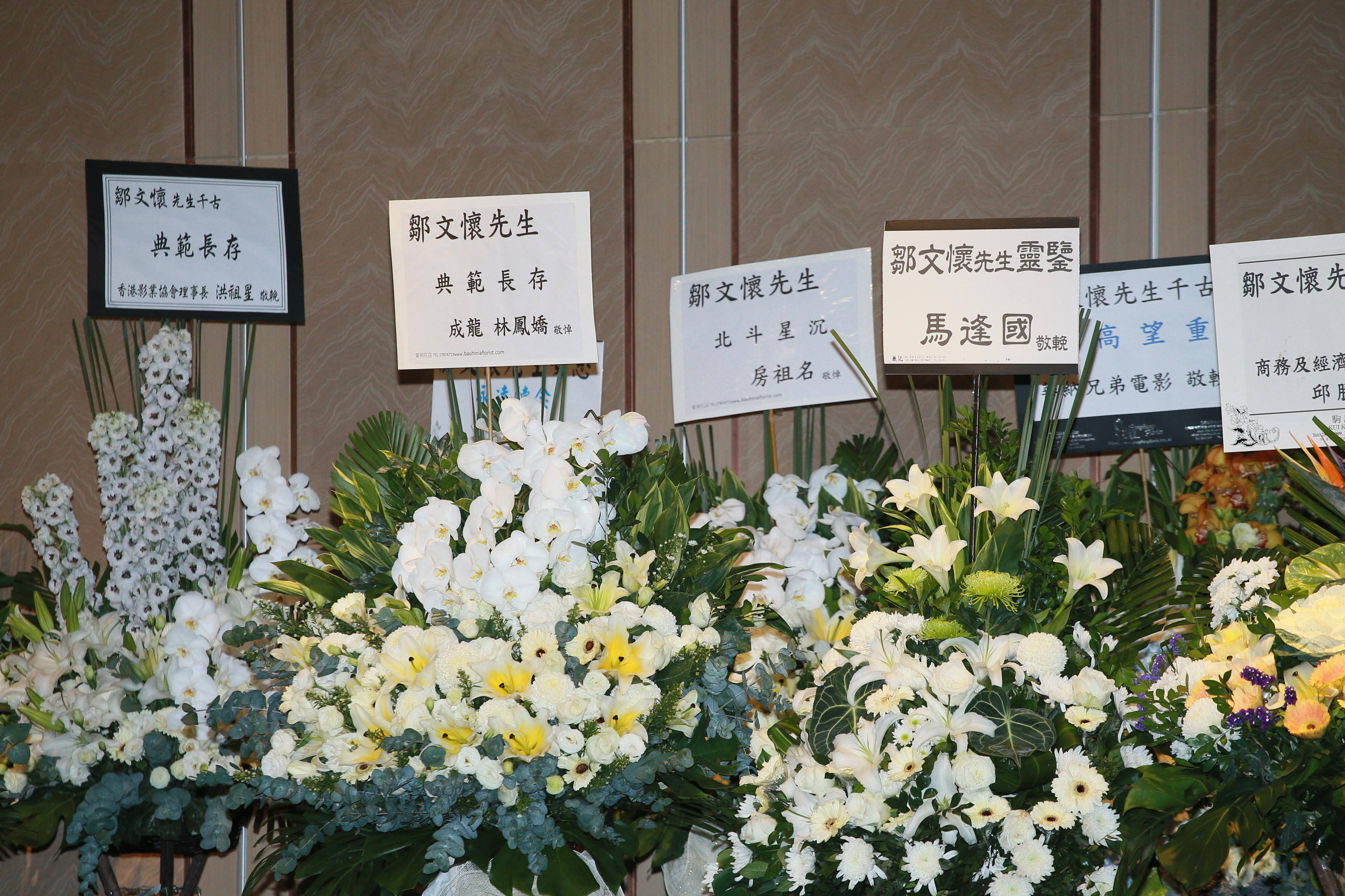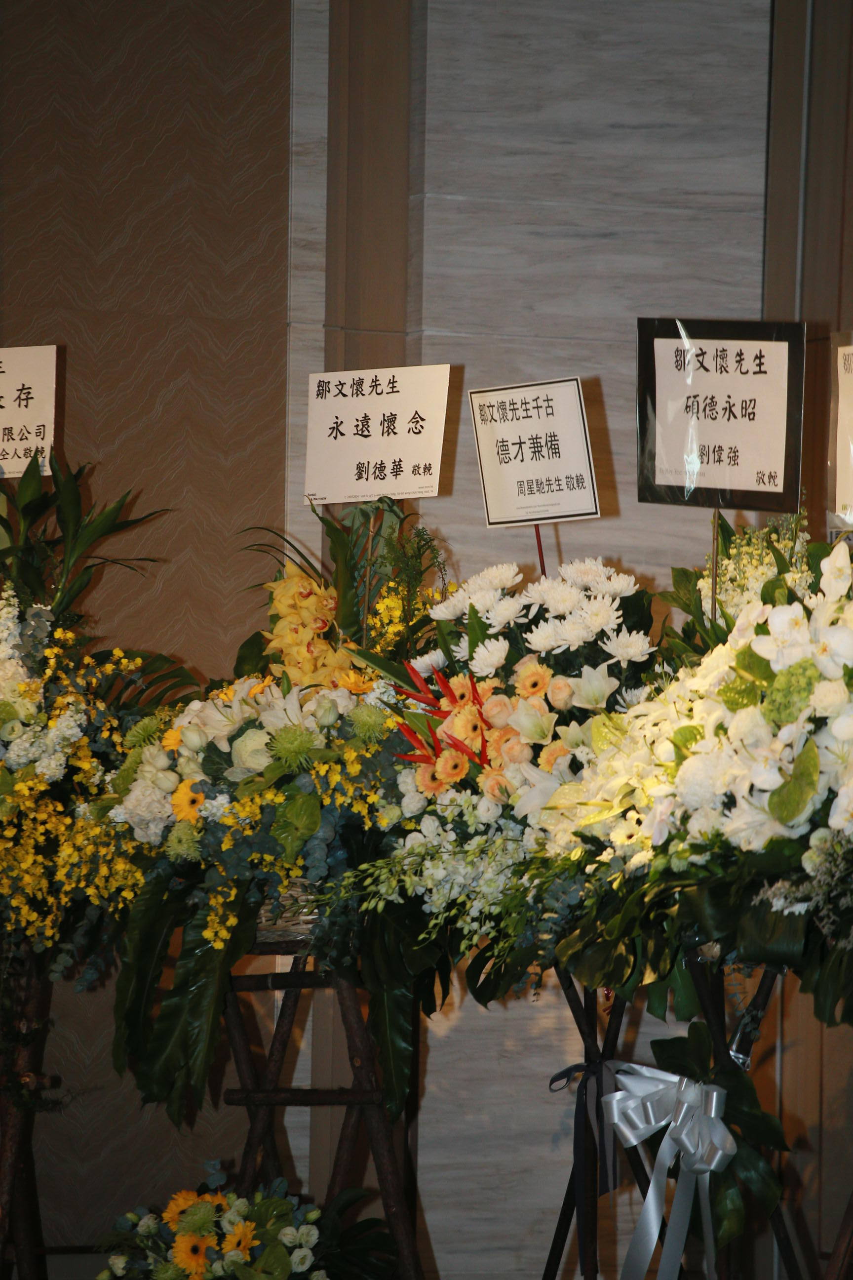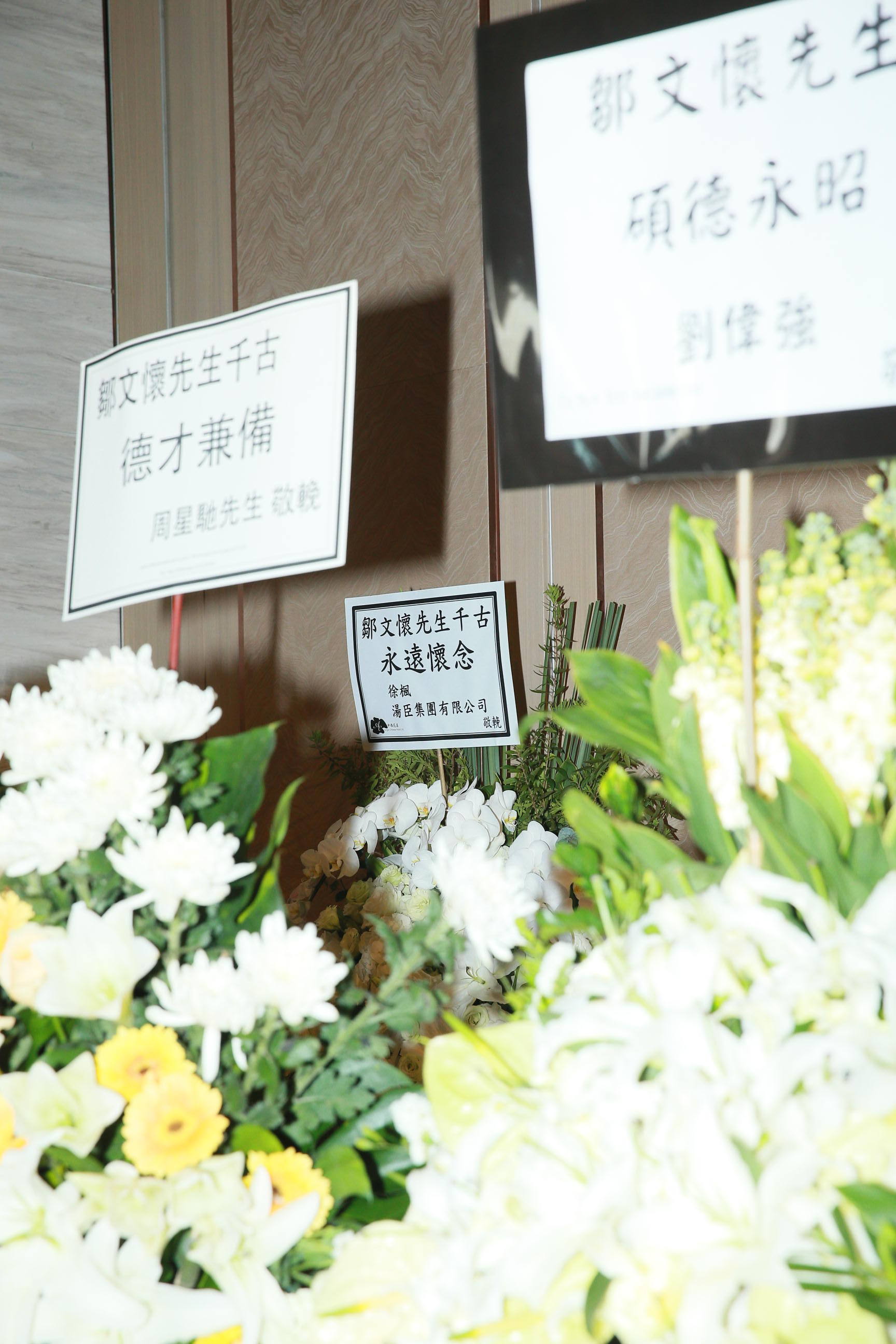 现场还放满社会各界人士送来的悼念花牌,刘德华的花牌上写着:“邹文怀先生,永远怀念”,周星驰送来的花牌上写着:“邹文怀先生千古,德才兼备”,成龙与林凤娇夫妇的花牌上写着:“邹文怀先生,典范长存”,房祖名的花牌上写着:“邹文怀先生,北斗星沉”,刘伟强的花牌上写着:“邹文怀先生,硕德永昭”。