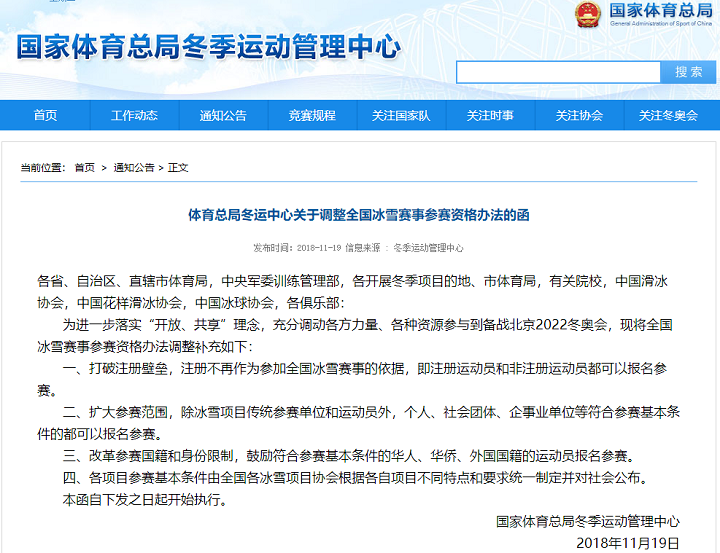 冬运中心在“关于调整全国冰雪赛事参赛资格办法的函”中称,为进一步落实“开放、共享”理念,充分调动各方力量、各种资源参与到备战北京2022冬奥会,现将全国冰雪赛事参赛资格办法调整补充如下: