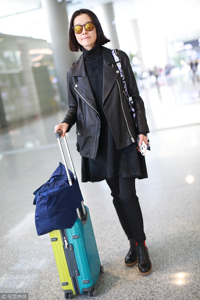 像是杜鹃前些天的机场Look中,烟管领毛衣裙外搭炫酷黑皮衣,行走中自带摇滚范,All Black照样吸睛无数。