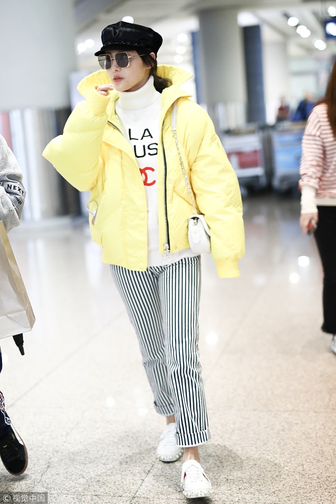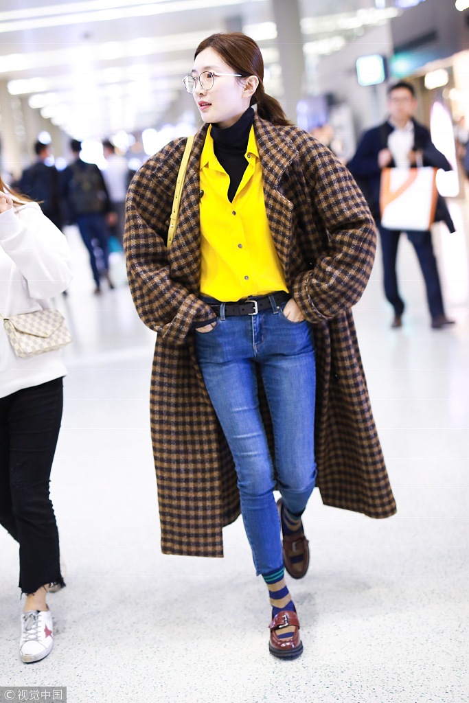 马苏之前在机场,以一件灰色的“烟管领”毛衫搭配卡其色大衣与牛仔裤,头戴报童帽,一身舒适便利又不失复古Chic。
