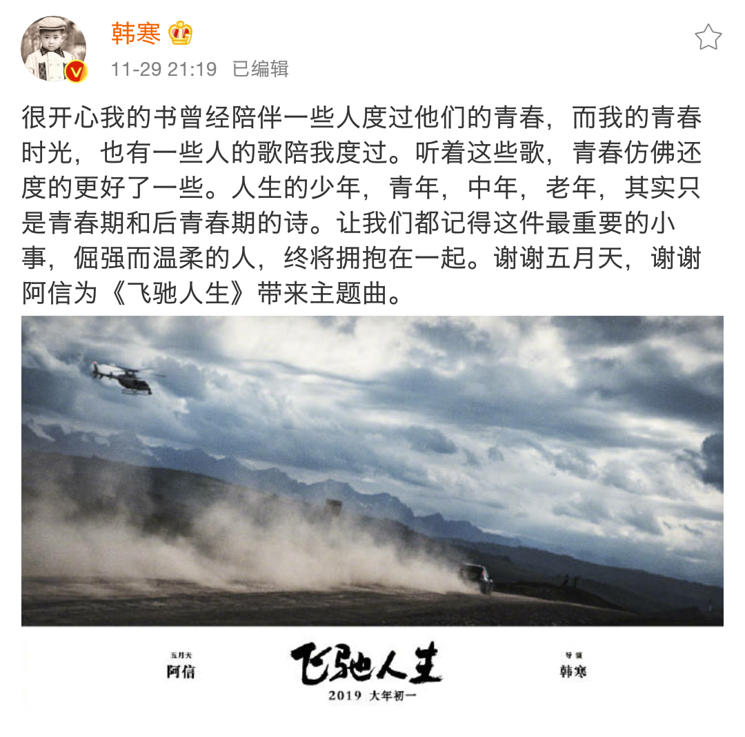 “韩信”出道,阿信献唱韩寒新片《飞驰人生》