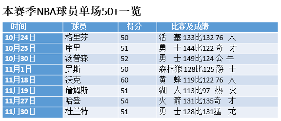 新赛季NBA开赛一个多月以来,先后有格里芬、库里、汤普森、罗斯、沃克、詹姆斯、哈登等7位球员砍下50+,经此一役,杜兰特还成为本赛季NBA第8位得分超过50分的球员。