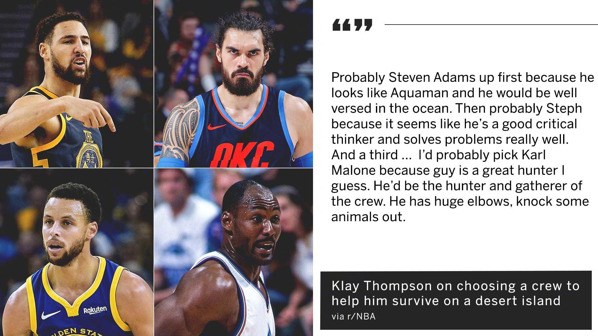有网友向汤普森提问道,“你被困孤岛,只可以选择3名NBA球员跟你共渡难关。你会选择谁,为什么?”汤普森第一个就选择了亚当斯,他兴致勃勃地表示,“我首先会选史蒂文·亚当斯,因为他看起来就像海王,他非常熟悉海洋。”