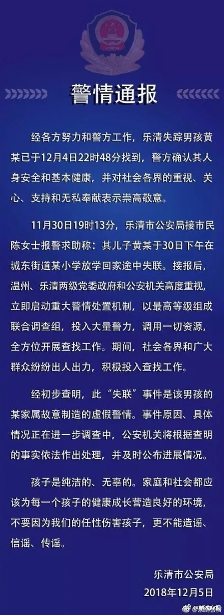 牵动人心的乐清男孩失联事件有了结果。据乐清市公安局消息,经各方努力和警方工作,乐清失踪男孩黄某已于12月4日22时48分找到,警方确认其人身安全和基本健康。