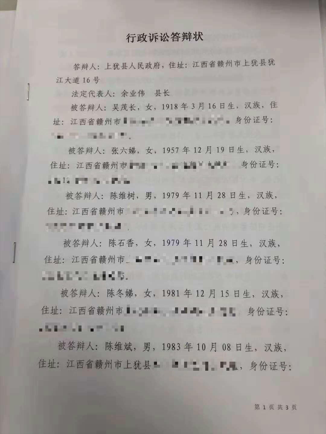 上犹县政府《行政诉讼答辩状》。 受访者供图