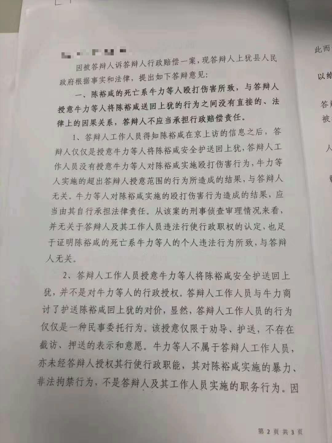 新京报讯(记者 卢通)今天(12月7日)下午,新京报此前报道的江西上犹上访者陈裕咸死亡事件传来进展。陈裕咸长子陈维树告诉新京报记者,上犹县政府于12月5日就陈维树此前提起的行政赔偿诉讼向赣州中院递交了《行政诉讼答辩状》,他于今天下午从律师处获取了该文件。答辩状称,陈裕咸死亡系牛力等人个人违法行为所致,与上犹县人民政府无关,上犹县人民政府不应当承担行政赔偿责任。