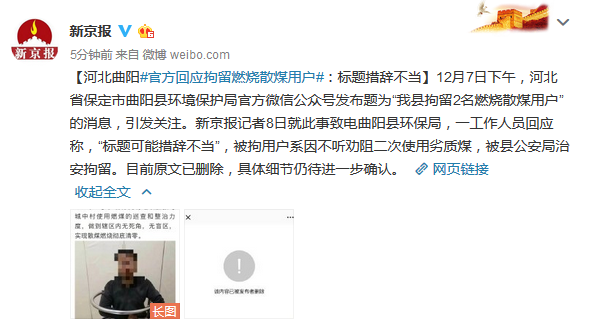需要注意的是,去年12月份,曲阳县就被曝出因燃煤锅炉排放达不到环保标准,需要进行“煤改电”改造,造成当地采暖季已开始近20天后,多个乡镇的多所乡村学校都未按时供暖。在一年之后曲阳县又因治理大气环境污染拘留两名燃烧散煤用户,也从侧面印证一些地方大气环境治理上存在冒进的问题。