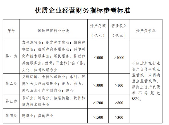 在主要经营财务指标中,建筑业和房地产业被列为第四类企业,需要同时满足资产和营收分别达到1500亿元和300亿元的门槛要求,并且资产负债率不超过85%。