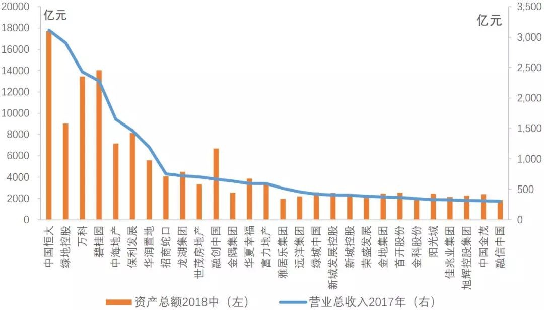 同样,2017年房企资产排行榜显示,总资产超过1500亿元的房企有32家,从第一名恒大地产资产总额为17618亿到第32名旭辉集团1518亿元。