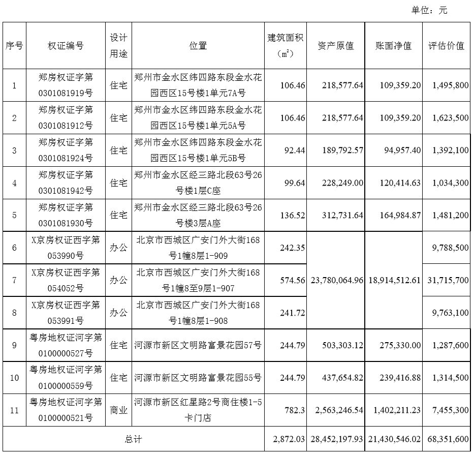 公告显示,11处房产的设计用途包括住宅7项、办公3项、商业1项。其中,位于郑州地区的金水花园房产目前用于公司员工住宿,明鸿新城房产目前用于公司存放物品或员工宿舍,均可于出售后交付。