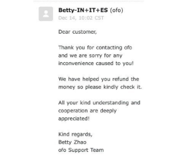 结果ofo火速退了押金,还回复了一封英文道歉信。