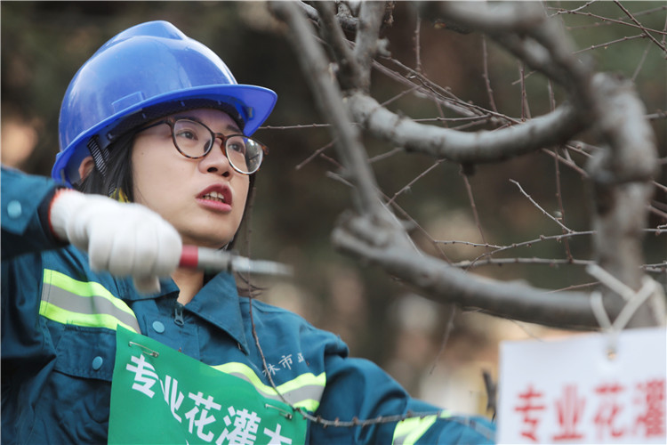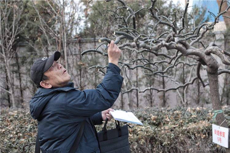 花灌木比赛区域,园林养护人员手持剪子,熟练地剪掉龙爪槐、西府海棠上的并枝。