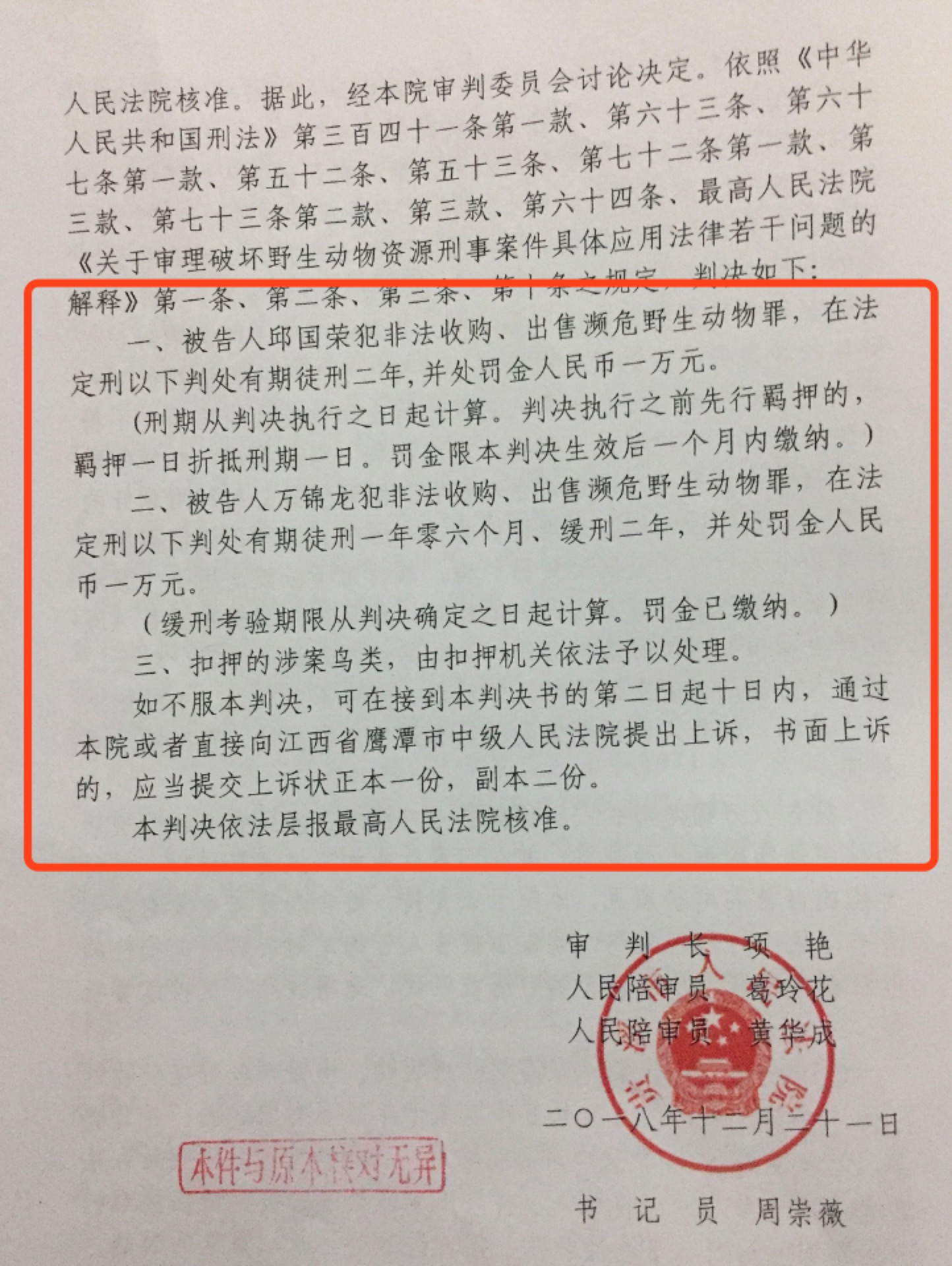 该份判决书显示,贵溪市人民法院一审判决:邱国荣犯“非法收购、出售濒危野生动物罪”,被判有期徒刑二年,判处罚金人民币一万元。万某龙被判有期徒刑一年零六个月,缓刑二年,判处罚金人民币一万元。