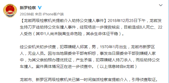原标题:龙岩两级检察机关提前介入劫持公交撞人事件