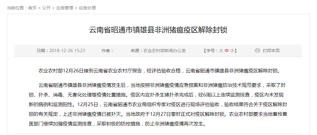 云南省昭通市镇雄县非洲猪瘟疫情发生后,当地按照非洲猪瘟疫情应急预案和非洲猪瘟防治技术规范要求,采取了封锁、扑杀、消毒、无害化处理等疫情处置措施。疫区内应扑杀生猪扑杀完成后,经6周以上连续监测排查,疫区内未发现新的病例和监测阳性。12月25日,云南省昭通市农业局组织专家对疫区进行现场评估验收,验收结果符合关于疫区解除封锁的有关规定,上述非洲猪瘟疫情已被扑灭。当地政府于12月27日零时正式对疫区解除封锁。农业农村部要求当地畜牧兽医部门继续加强疫情监测排查,采取积极的防控措施,防止非洲猪瘟疫情再次发生。