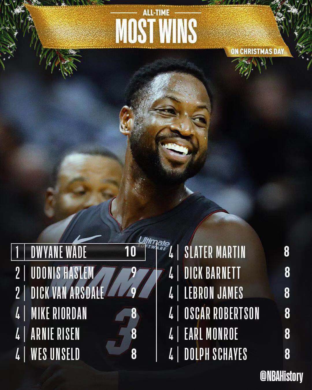 詹姆斯生涯第13次在圣诞大战出场,收获第9场胜利,距离韦德仅差1场。