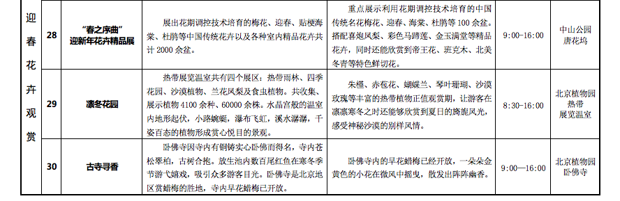 在迎春花卉观赏类活动中,中山公园照例在老北京传统赏花处唐花坞里举办迎新年花卉精品展,展示花期调控技术培育的中国传统名花——梅花、迎春、榆叶梅、杜鹃。玉渊潭公园首次在“樱落花谷”新景区探索栽植3万余株羽衣甘蓝,错落有致的条块花境成为冬季户外赏花一景。北京植物园热带展览温室中朱槿、赤苞花、蝴蝶兰、琴叶珊瑚、沙漠玫瑰等丰富的热带植物正值观赏期,让游客在寒冬里欣赏到夏日风光。