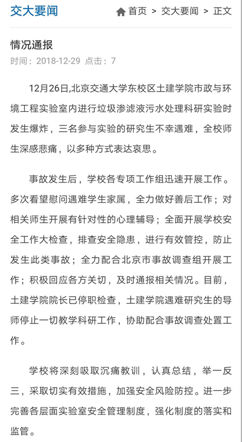 北京交通大学表示,将深刻吸取沉痛教训,认真总结,举一反三,采取切实有效措施,加强安全风险防控。进一步完善各层面实验室安全管理制度,强化制度的落实和监管。