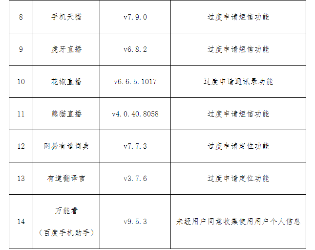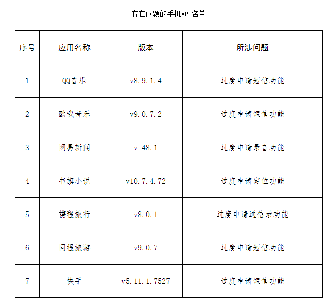通过技术检测以及用户举报发现,QQ音乐等18款APP疑似存在过度收集“短信”“通讯录”“位置”“录音”等用户敏感信息,万能看等9款APP疑似存在未经用户同意收集使用用户个人信息。针对发现的问题,结合相关互联网企业的意见,与会专家进行了热烈讨论和评议。经过评议,专家一致认为各相关互联网企业在加强用户个人信息保护方面做出了积极努力,但仍然存在一些不规范的问题,14款APP存在过度收集用户个人信息、未经用户同意收集使用用户个人信息等问题(详见附件)。芒果TV、趣头条、图吧导航、金山词霸、宜搜小说、信用金卡、你我贷、猪宝钱包、美期分期、信用白条、安逸花、掌e贷、宜人贷等13款APP所属企业未到场参会,会议要求上述企业尽快与中国互联网协会联系,确认收集、使用用户个人信息方面存在的问题,下一步将进行专门约谈并通告。