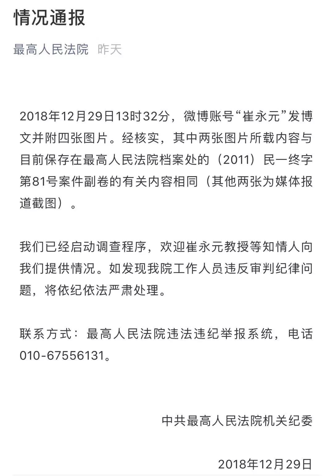 12月29日,微博账号“崔永元”发博文并附四张图片,对“案卷丢失”提出质疑。随即,最高法发布情况通报,经核实,其中两张图片所载内容,与目前保存该院档案处的(2011)民一终字第81号案件副卷的有关内容相同,表示已经启动调查程序,欢迎崔永元教授等知情人提供情况,如发现工作人员违反审判纪律问题,将依纪依法严肃处理。