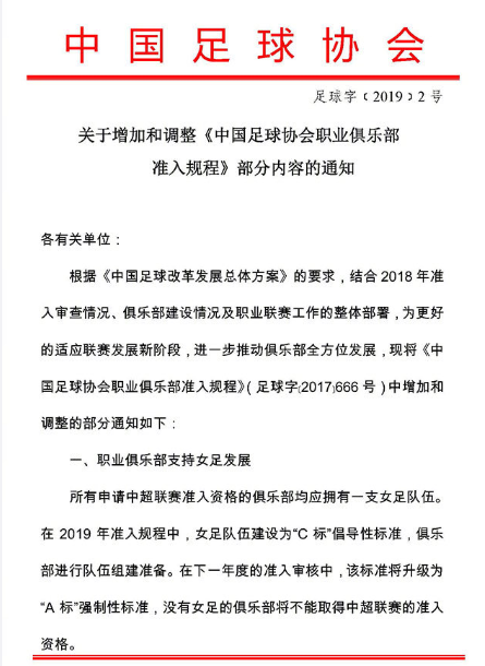 据央视新闻消息,中国足协今天官方发布了关于增加和调整《中国足球协会职业俱乐部准入规程》部分内容的通知,通知显示:所有申请中超联赛准入资格的俱乐部均应拥有一支女足队伍。在2019年准入规程中,女足队伍建设为“C标”倡导性标准;2020年则将会升级为“A标”强制性标准,没有女足的俱乐部不能取得中超联赛的准入资格。