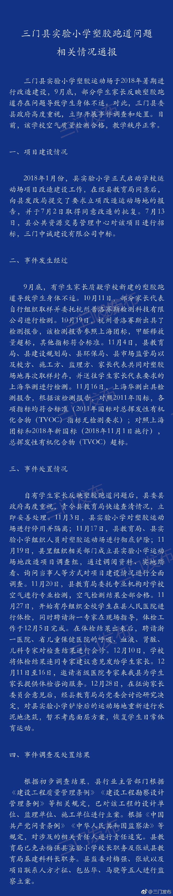 新京报快讯 据中共浙江省三门县委宣传部官方微博消息,三门县实验小学塑胶运动场于2018年暑期进行改造,9月底部分学生家长反映塑胶跑道存在问题导致学生身体不适。对此,三门县委县政府高度重视,立即展开调查和处置。