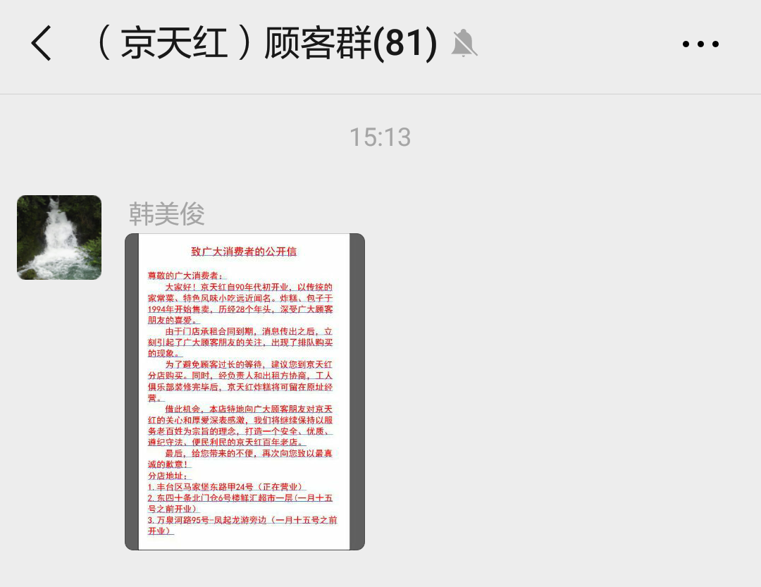 最新的公开信中提到,京天红自上世纪90年代初开业,以传统的家常菜、特色风味远近闻名。炸糕、包子于1994年开始售卖。由于门店承租合同到期,引起顾客的关注,出现了排队购买现象。为避免顾客过长地等待,经负责人和出租房方面协商,工人俱乐部装修完毕后,京天红炸糕可留在原址经营。