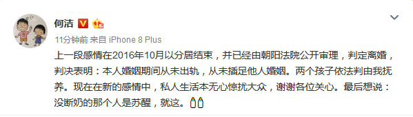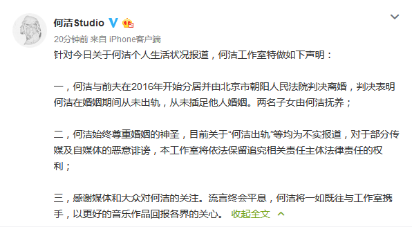 何洁工作室同时发布声明称“何洁出轨”为不实报道,再次强调何洁与前夫在2016年开始分居并由北京市朝阳人民法院判决离婚,判决表明何洁在婚姻期间从未出轨,从未插足他人婚姻。两名子女由何洁抚养。