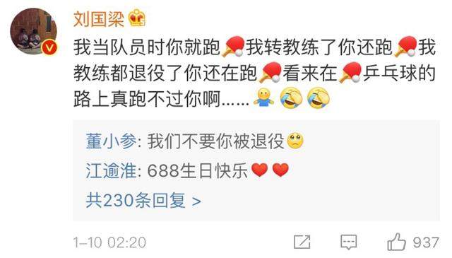 去年1月10日凌晨2点,刘国梁在社交平台上回复好友李武军的生日祝福。