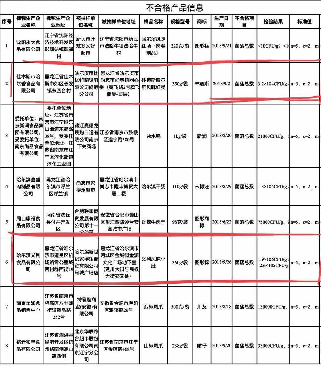1月15日,国家市场监督管理总局通报8批次不合格肉制品,其中包括1批次林道斯哈尔滨风味红肠和1批次哈尔滨义利风味小肚,不合格项目为菌落总数。