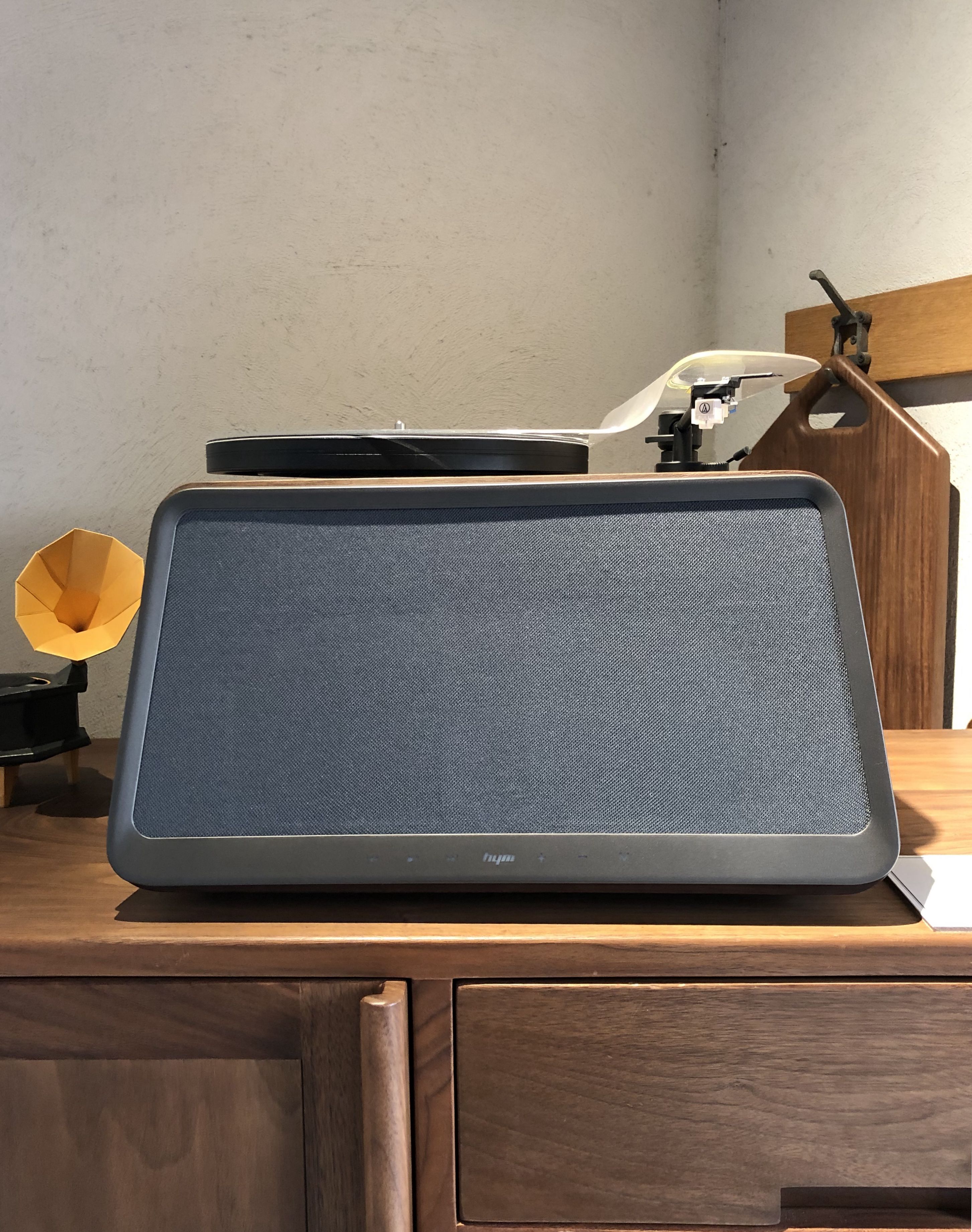 这款音响的设计比较中规中矩,箱体选用胡桃木色,多了几分古典韵味。音响搭载的黑胶唱片机并不只是装饰,真的可以用来播放黑胶唱片。黑胶唱片机与智能音响的巧妙融合省去了唱机、功放、喇叭等许多传统黑胶唱片机的系统配置。是新中式、古典风格家庭的不错选择。摆放在客厅,还可以和电视连接,打造家庭影院。
