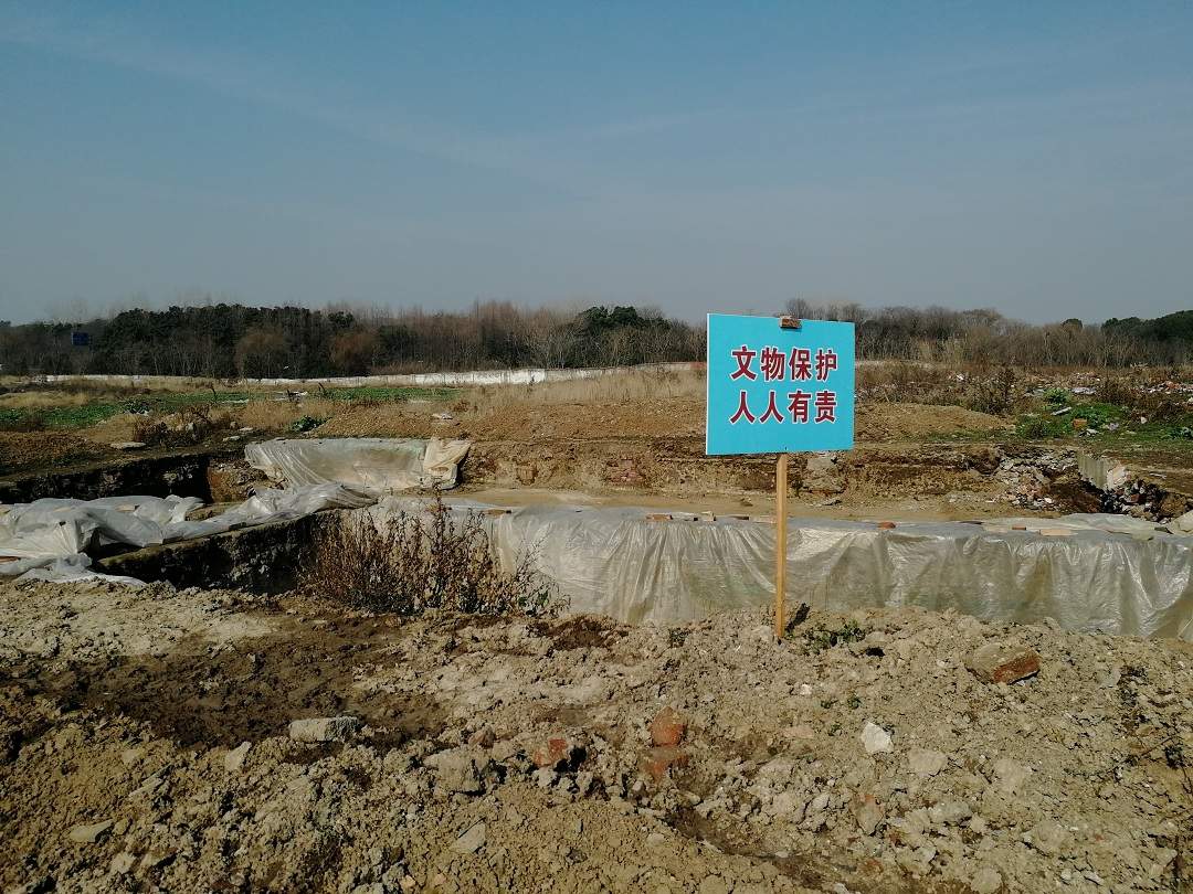 考古发掘现场树立“文物保护,人人有责”的警示牌。