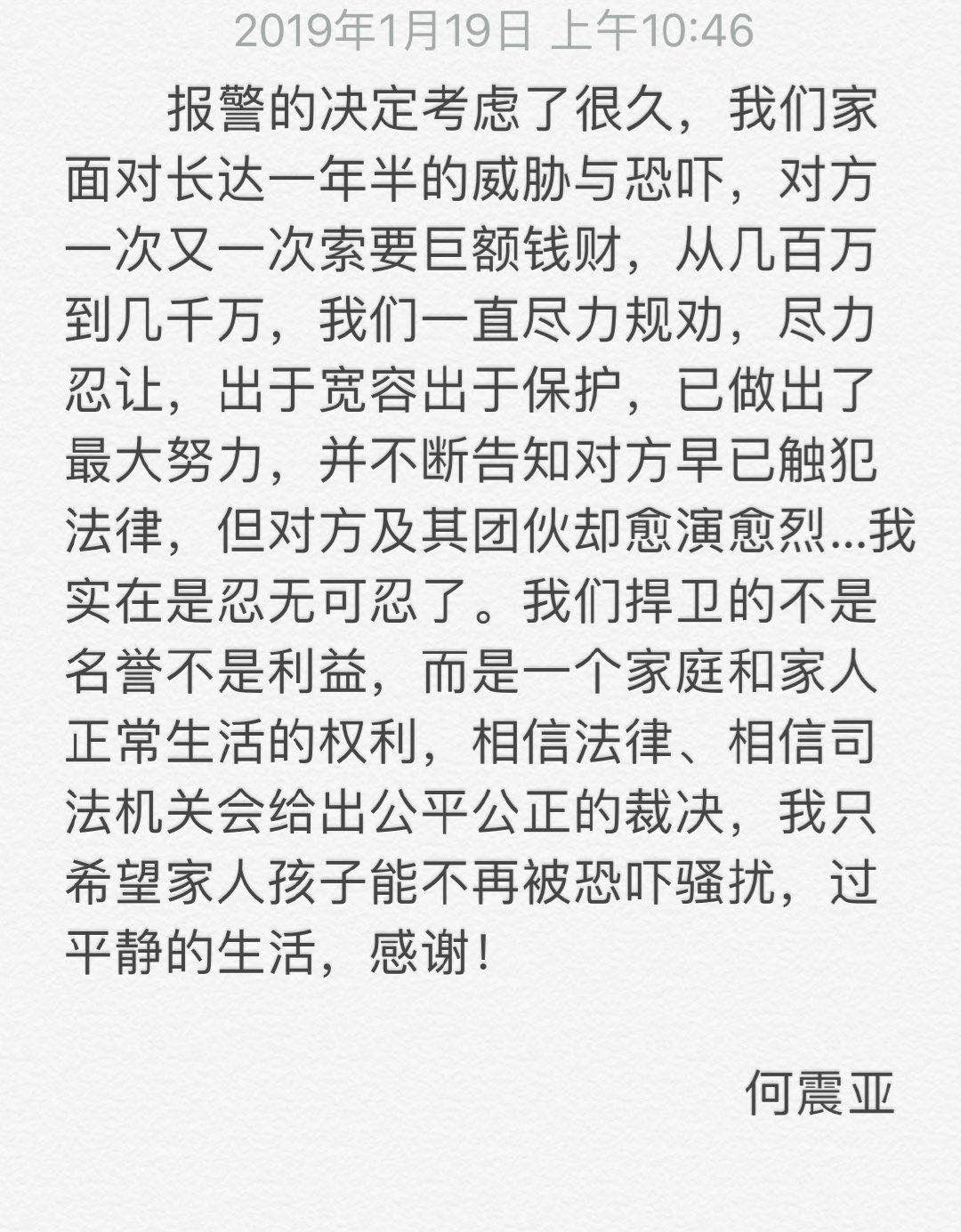 新京报讯 (记者 张赫)1月19日,吴秀波的妻子何震亚通过吴秀波工作室发布声明,回应吴秀波“出轨门”女子因涉嫌敲诈勒索被拘捕一事。何震亚称,她的家庭遭受了长达一年半的威胁和恐吓,对方多次索要钱财,从几百万到几千万,并透露陈昱霖有团伙,“我们一直尽力规劝,尽力忍让,出于宽容出于保护”,“但对方及其团伙却愈演愈烈”。何震亚表示,相信司法机关会给出公正的判决,“我只是希望家人孩子能不再被恐吓骚扰。”