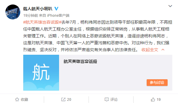 据中国载人航天工程网官方微博消息,去年7月,杨利伟同志因达到领导干部任职最高年限,不再担任中国载人航天工程办公室主任,根据组织安排正常转岗,从事载人航天工程相关管理工作。近期,个别人在网络上恶意诋毁航天英雄,造谣诽谤杨利伟同志,这是对航天英雄、中国飞天第一人的严重污蔑和恶意中伤。对这种行为,我们强烈谴责、坚决反对,并将依法严肃追究有关当事人的法律责任。