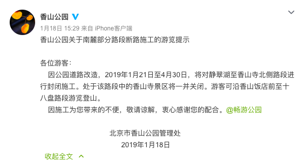 新京报讯(记者 周依)香山公园日前在官方微博发布“香山公园关于南麓部分路段断路施工的游览提示”,指出因公园道路改造,1月21日至4月30日香山寺景区将关闭。