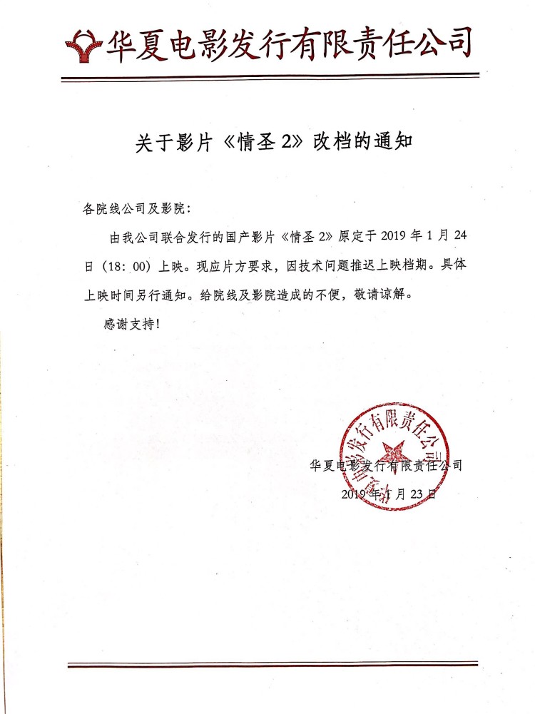 新京报讯 (记者 滕朝)1月23日,网上传出电影《情圣2》撤档的消息,新京报记者联系到宣传方,对方发给记者一张写有“感恩同行,来日再见”的图片,证实电影撤档的消息。新京报记者又联系了保利影城北京某店的经理,对方也证实了该消息,“我们影院退了100余张票,烦躁”。他还发给记者一份“关于影片《情圣2》改档的通知”,通知写道:“由我公司联合发行的国产影片《情圣2》原定于2019年1月24日(18:00)上映,现应片方要求,因技术问题推迟上映档期。具体上映时间另行通知,给院线及影院造成的不便,敬请谅解。”落款为华夏电影发行有限责任公司。